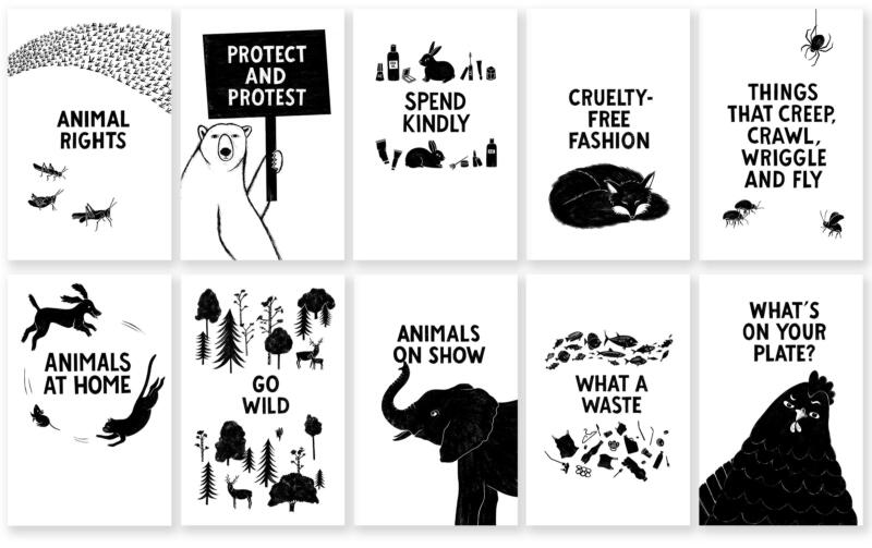 ”Cruelty free”, illustrationer och handskriven text till omslag och inlaga, 2021