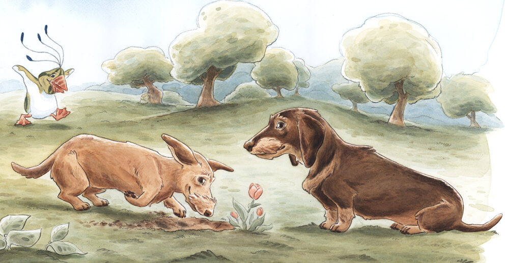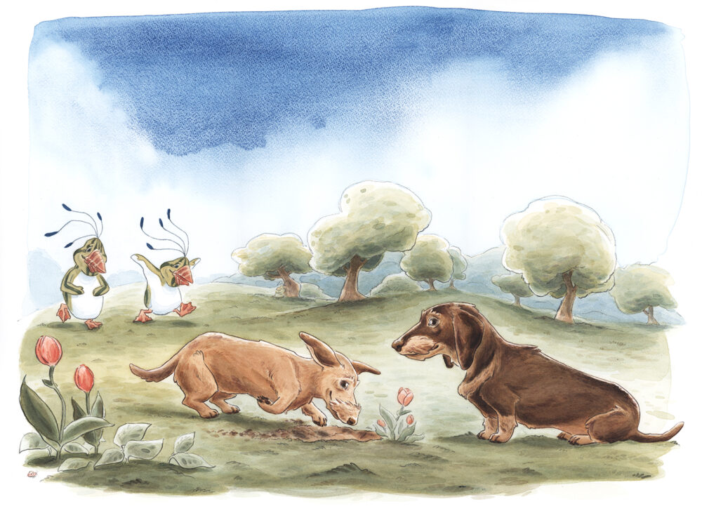 Akvarellmålning. Till vänster i bilden syns två melonpingviner som kommer springande för att stoppa taxen som gräver.