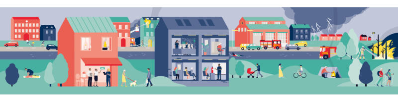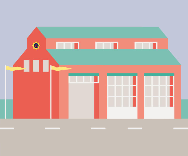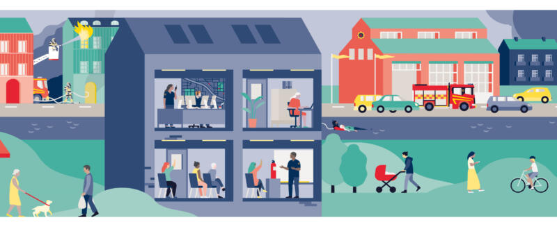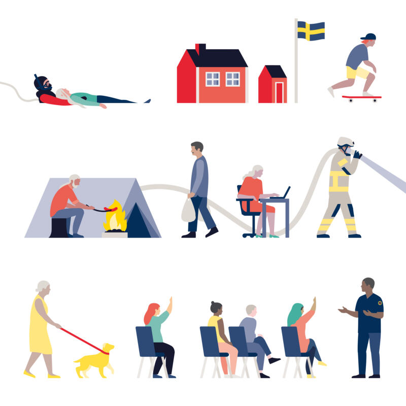 Illustrationer till Räddningstjänstens grafiska profil. Bl.a en större stadsbild med situationer ur Räddningstjänstens olika uppdrag. Situationerna används även till separata presentationer, broschyrer, affischer och mer.