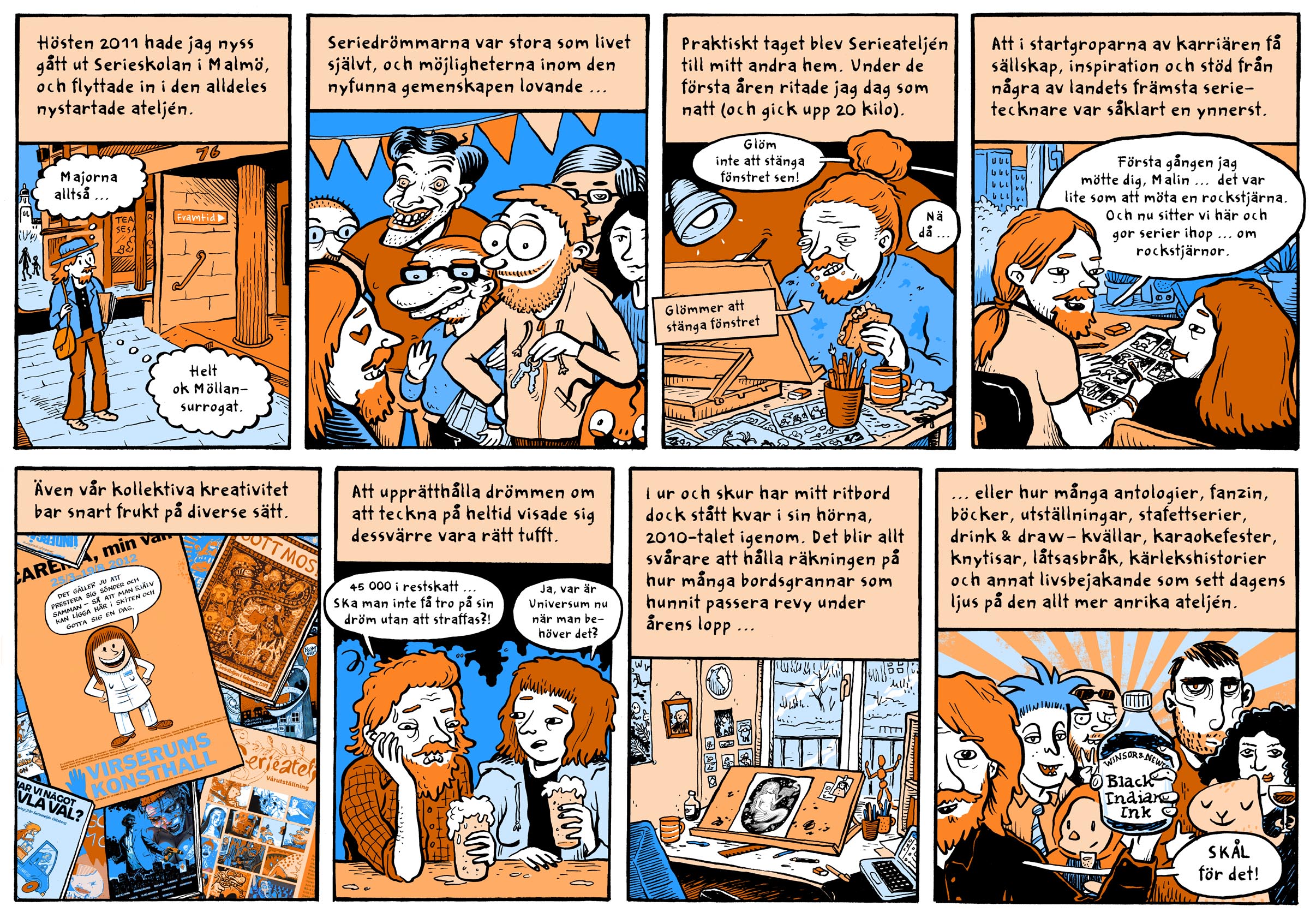 Jag är verksam i Göteborg sedan 2011. Främst tecknar jag illustrationer och serier till en rad tidningar, men jag jobbar gärna även med bokprojekt med varierande genrer och målgrupper. Mina bilder präglas ofta av detaljrikedom, humor och värme. Jag är även utbildad/verksam pedagog, vilket jag upplever som en fördel när det gäller att teckna för barn.