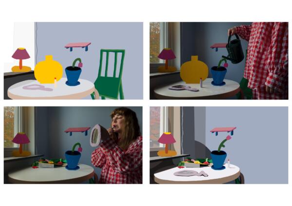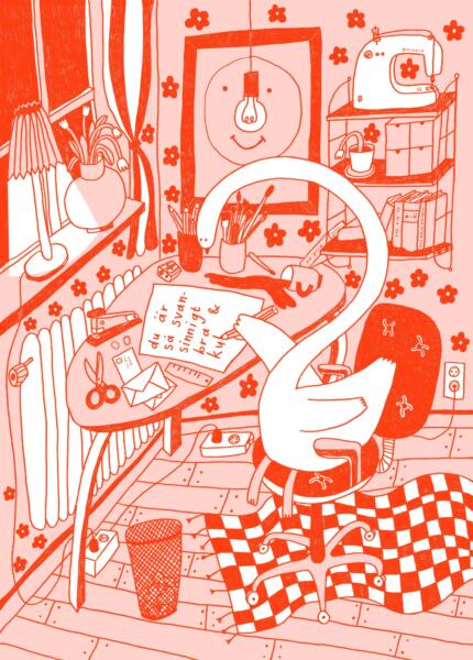 Jag är den textildriven illustratör som skapar berättelser genom samspelet mellan teckningar och material. Min praktik handlar mycket om att illustrera vardagliga miljöer, rita upp hem och rum, och saker till hem och rum. Då finns det inga begränsningar i hur jag inreder dessa miljöer, begäret och behovet och formen och funktionen behöver inte förhålla sig till verklighetens ramar.