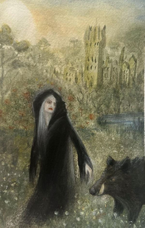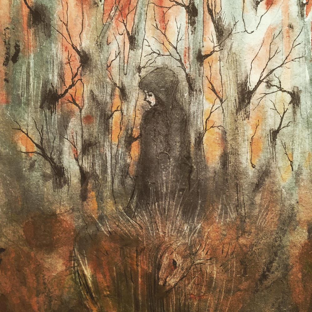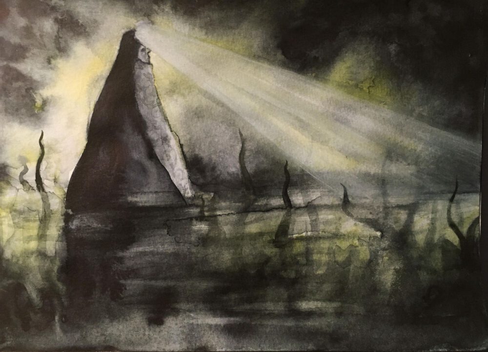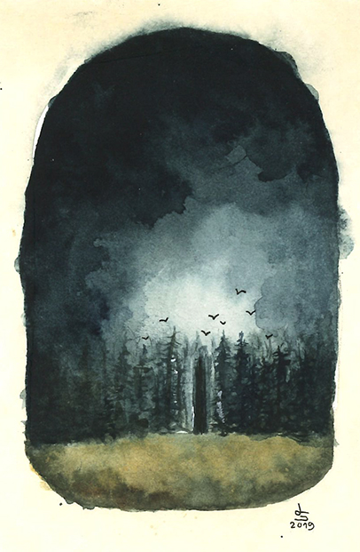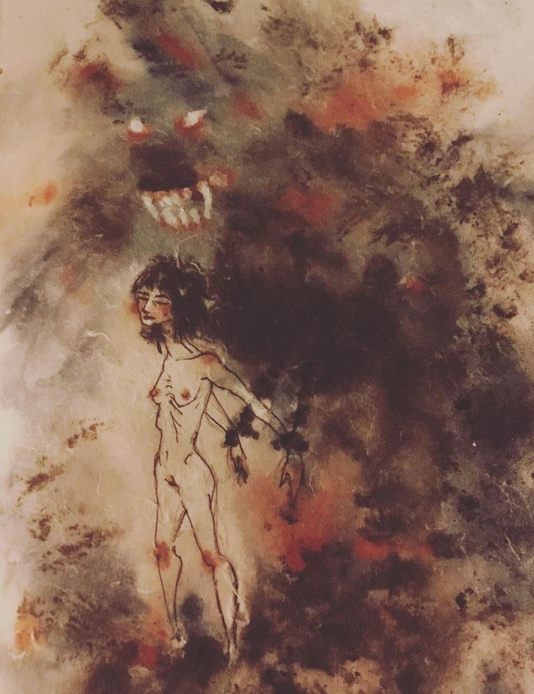 Ur askan i elden - illustration till mitt poem En ode till kärlekens kval eller En himmelsk begravning, akvarell & tusch, 2020