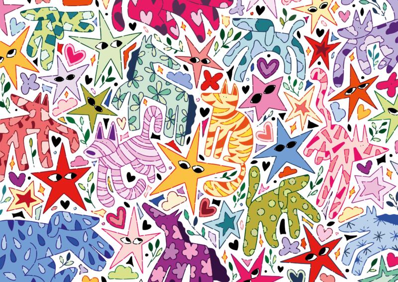 Ett färgstarkt, detaljrikt och nästan drömlikt mönster. Mitt fokus under detta projekt låg på att tillåta mig själv vara lekfull och låta fantasin få ta plats på pappret. Det resulterade i ett smått kaotiskt hav av former och färg!