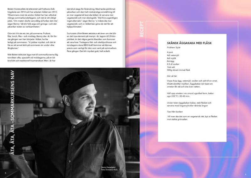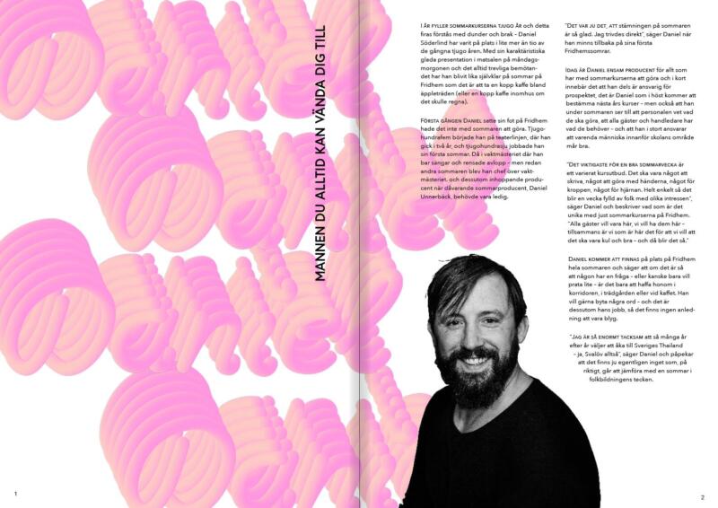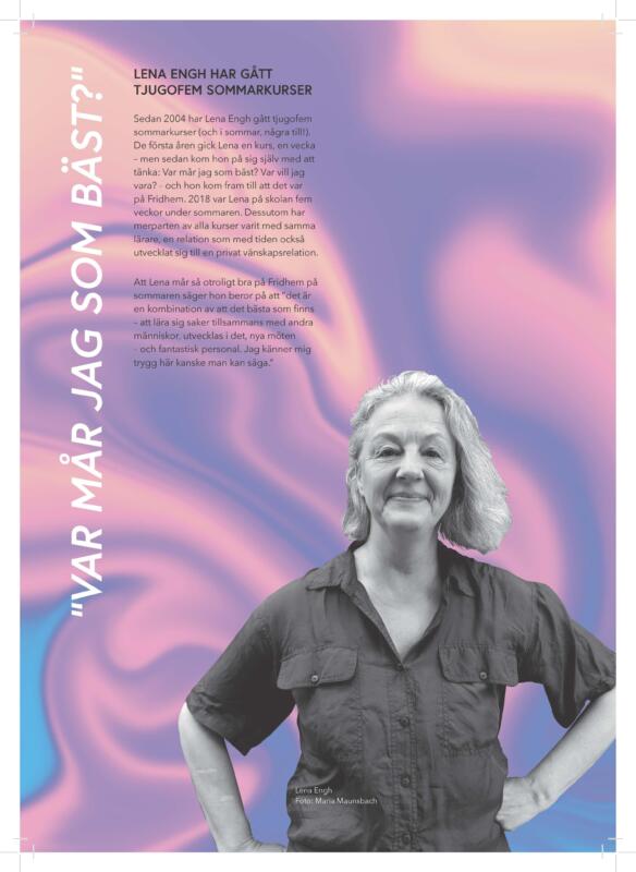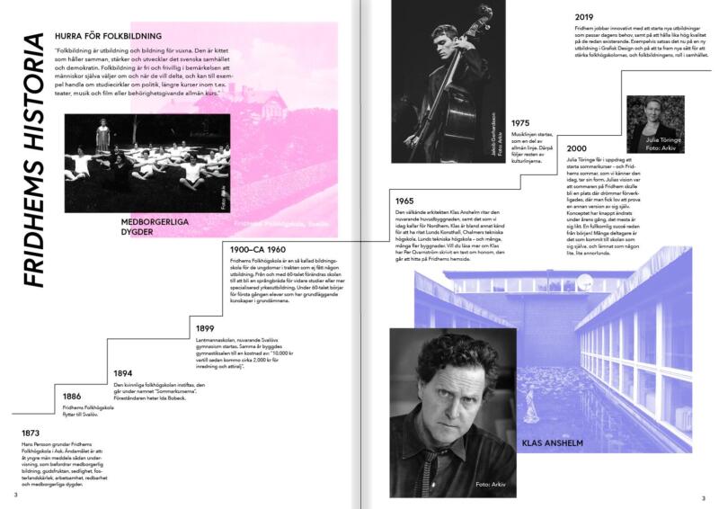 Jag driver grafisk design-linjen på Fridhems folkhögskola och hjälper ofta skolan med designuppdrag. Här ville skolan fira sommarkursernas 20-årsjubileum, men också göra reklam för sin ordinarie verksamhet och berätta om sin långa historia. Maria Maunsbach skrev, Emmalisa Pauly fotograferade, Tora Essley var visuell rådgivare, jag gjorde grafisk form, illustrationer och infografik.