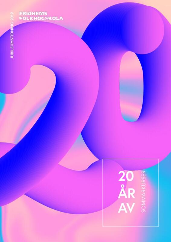 Framsida till jubileumstidskrift för Fridhems folkhögskolas sommarkurser. Siffran tjugo skriven i mjuk 3D-form i lila, rosa och blå toner.