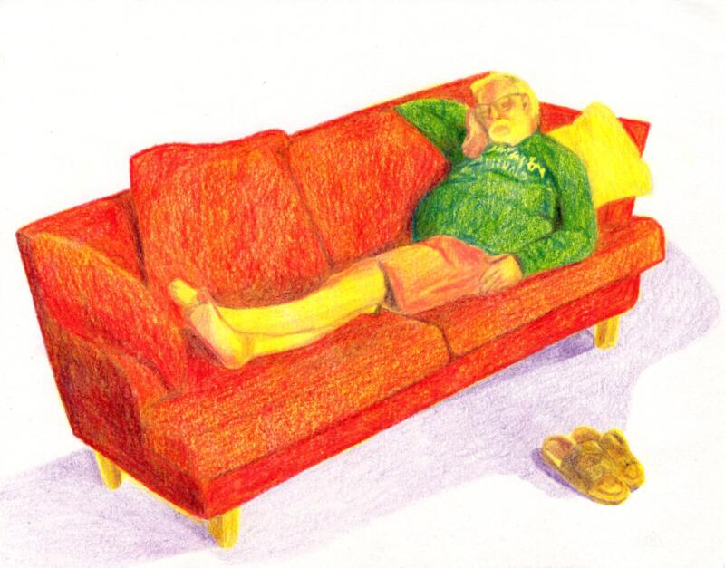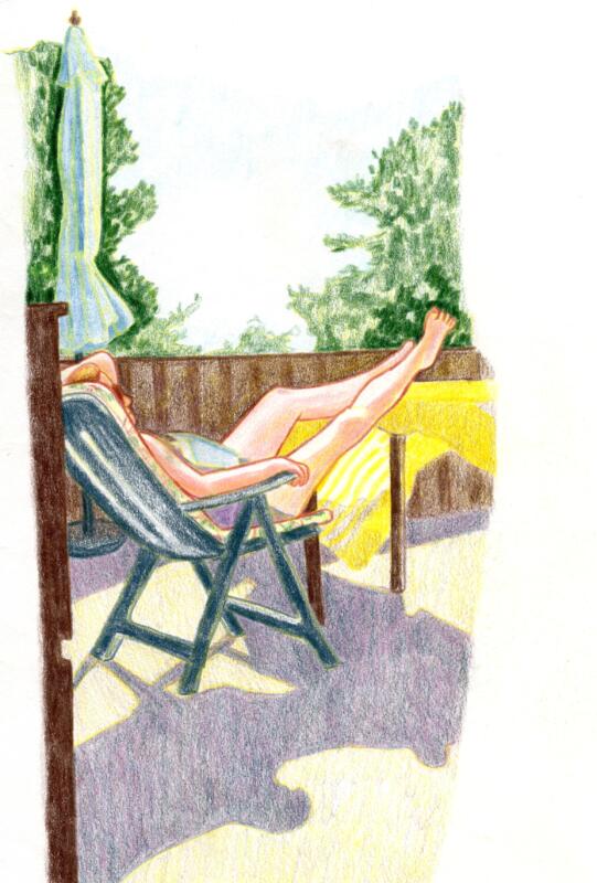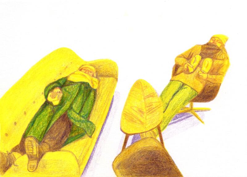 Illustrationer tecknade med akvarell- och färgpennor av personer som vilar sig