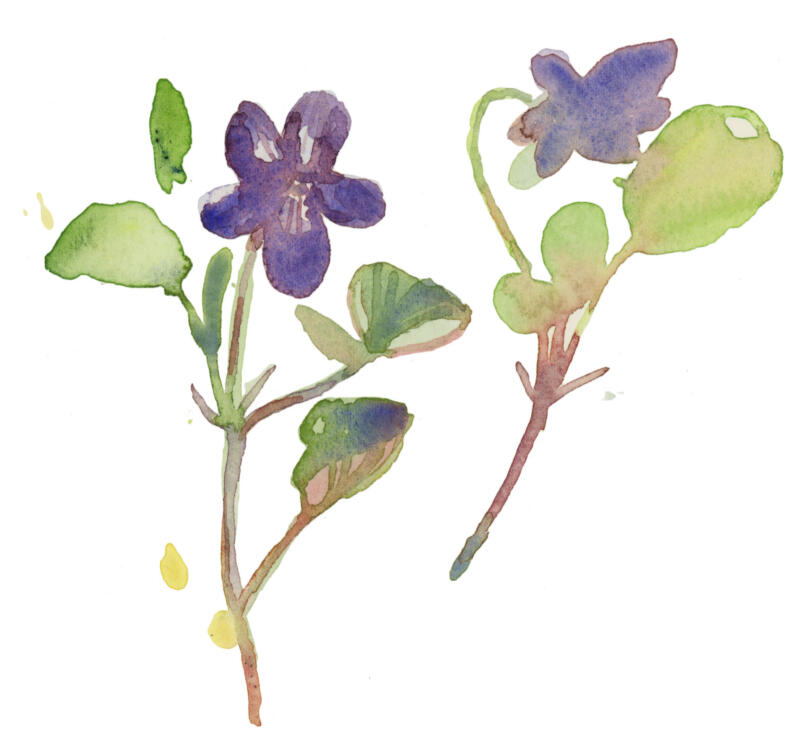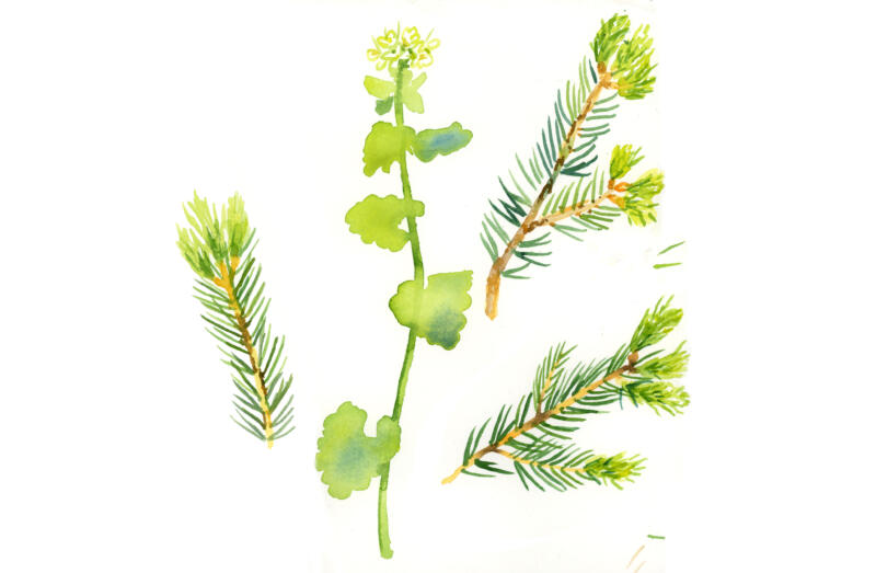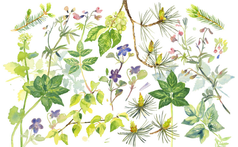 Ätbara växter i maj. Granskott, tallstruntar, almfrön, björklöv, gökärt, viol, löktrav, kirskål, nässlor och blåbärsblomma.