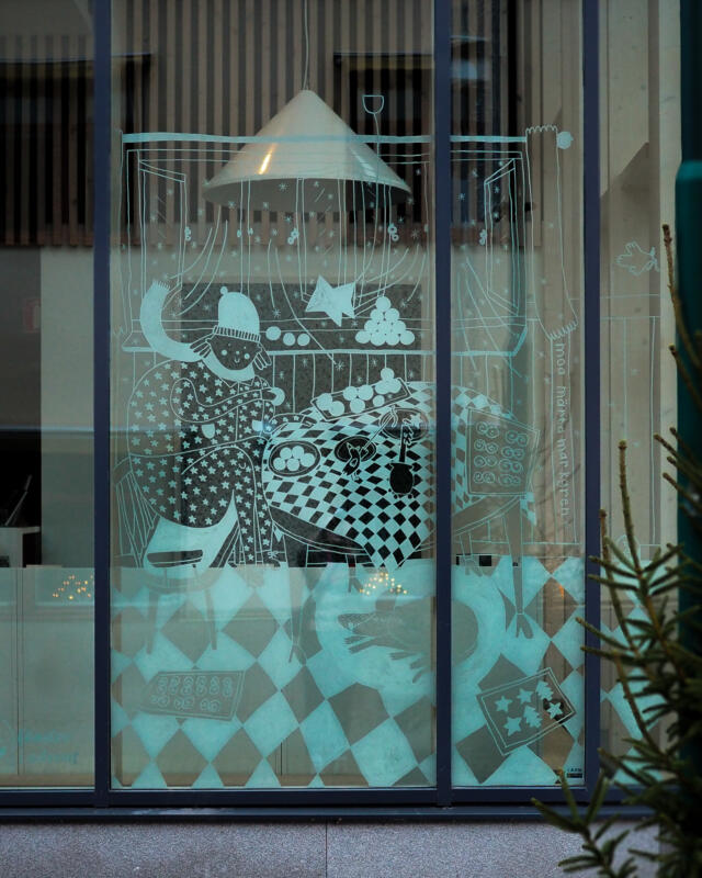 Fönstermålning på uppdrag av Lidköpings konsthall och deras projekt ”Fyra fönster i advent”. Alla fönster målades med vit färg för att de skulle hänga ihop trots de olika konstnärerna som målade dem, och jag målade mitt med poscapennor.