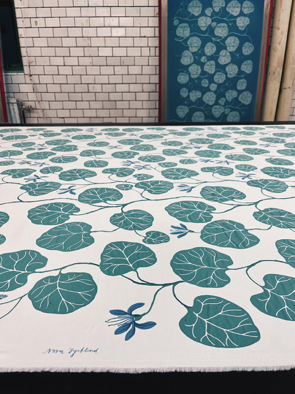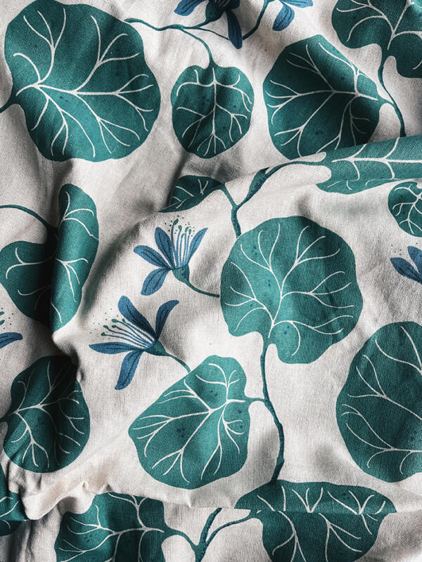 Eget projekt, handtryckt mönster på textil med två färger. Originalet är ritat digitalt efter en skiss i gouache.