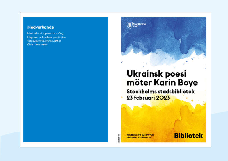 Folder om ukrainsk poesikväll på Stockholms stadsbibliotek. Uppdragsgivare Stockholms stad/Kulturförvaltningen. (Bakgrundsbilden är hämtad från Canva).