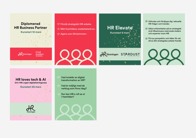 Exempel på infografik/kampanjmaterial gjort till Linkedin, Facebook och Instagram för att informera om och maknadsföra kursutbud. Ett bland många uppdrag hos HR-föreningen.