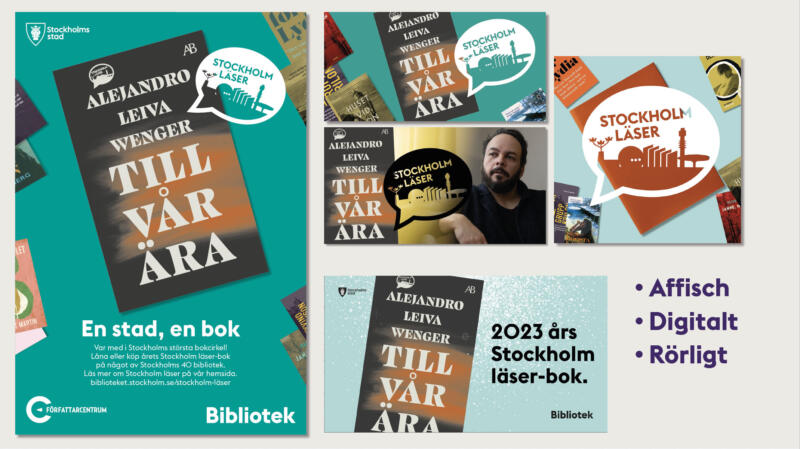 Inom Stockholm läser anordnar Stockholms stadsbibliotek varje år bokcirklar, författarsamtal och andra evenemang med anknytning till en utvald bok. Under 2023 utfomade och författade jag marknadsföringsmateralet till Stockholm läser. Här är ett exempel från kampanjen som gick på webben, sociala medier och på digitala skyltar inne i biblioteken. (Skapat i Canva)