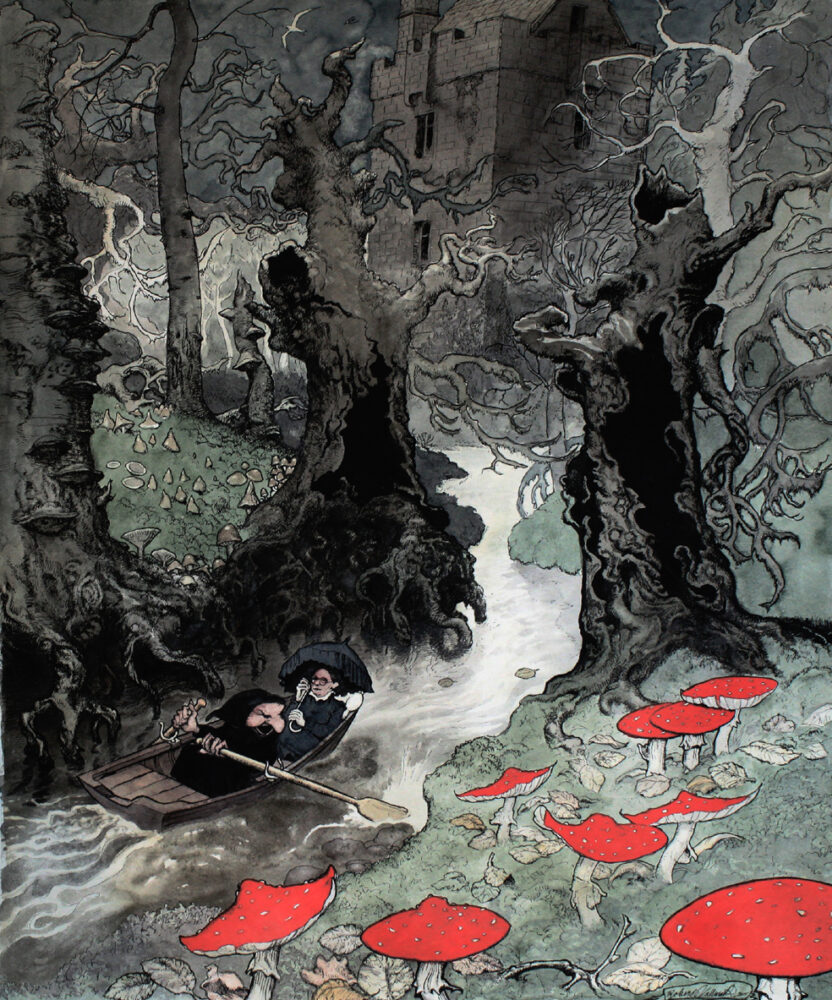 Häxa, slott, röd flugsvamp. Tusch och akvarell.