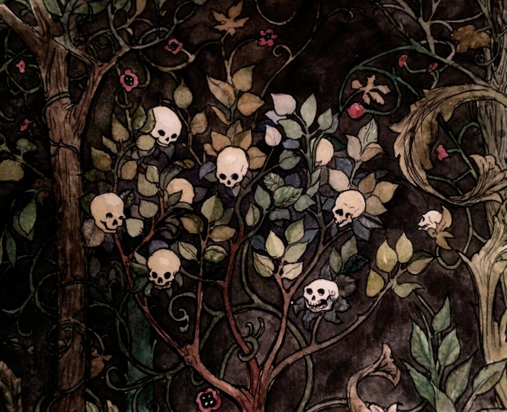 Ornamentalt träd, dödskallefrukt, "Persisk stil", tusch och akvarell.