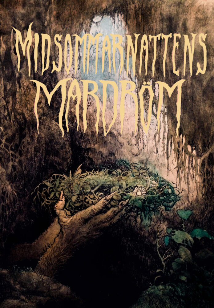 Trollhänder, framsträckandes en midsommarkran, ur klippskreva, från underjordiska salar. Ink and watercolour original.