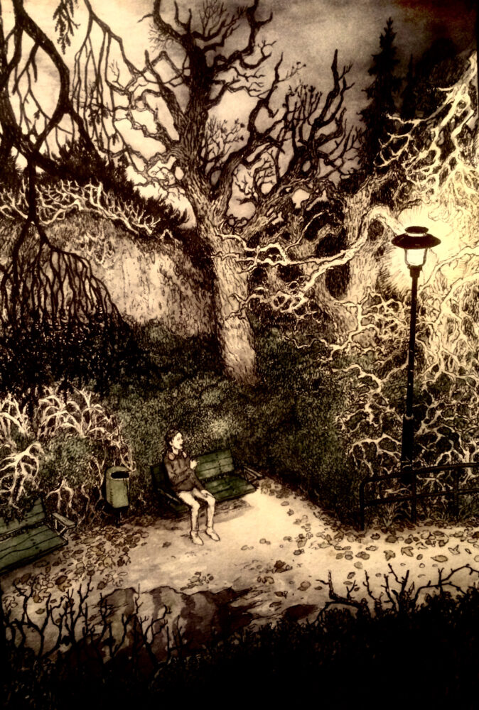 Parkbänk, rökning i skenet av gatlyktan. November. Tusch och akvarell.