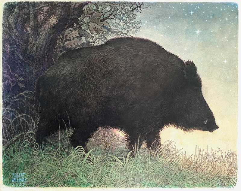 Äppelträd, försommar, midnatt, belyst av gatlykta. Tusch och akvarell.