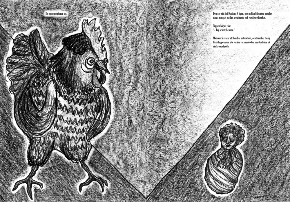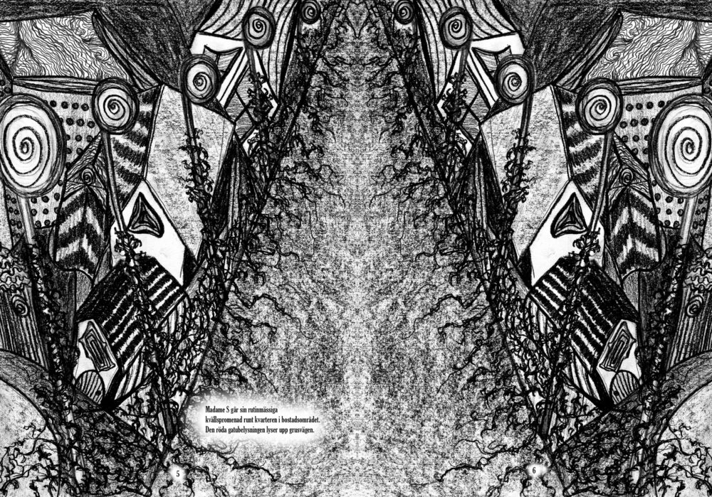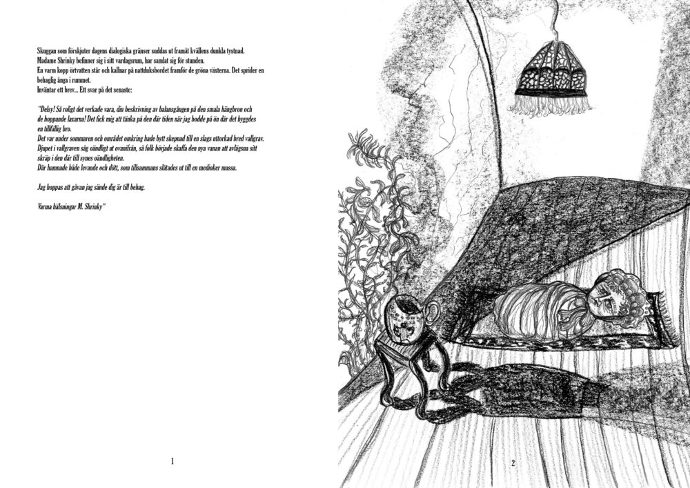 Madame Shrinky är en 32 sidor lång bilderbok som handlar om en suggestiv brevväxling mellan M. Shrinky och hennes vän Delsy. Illustrerad, författad och publicerad genom risograf av mig år 2019.