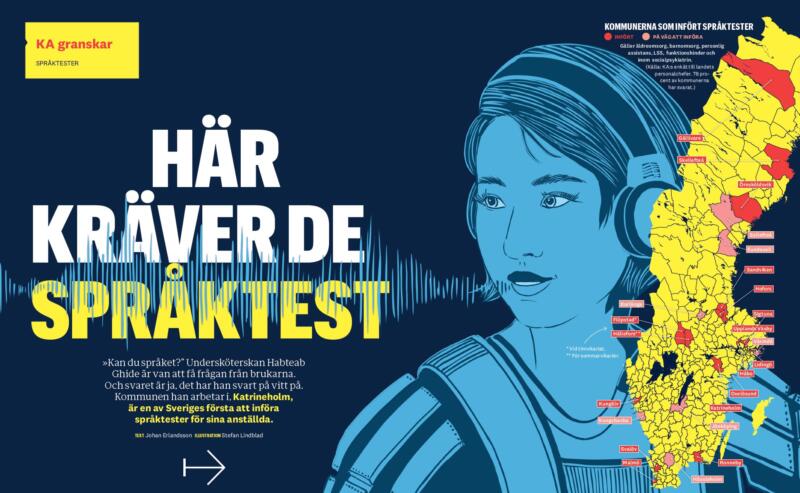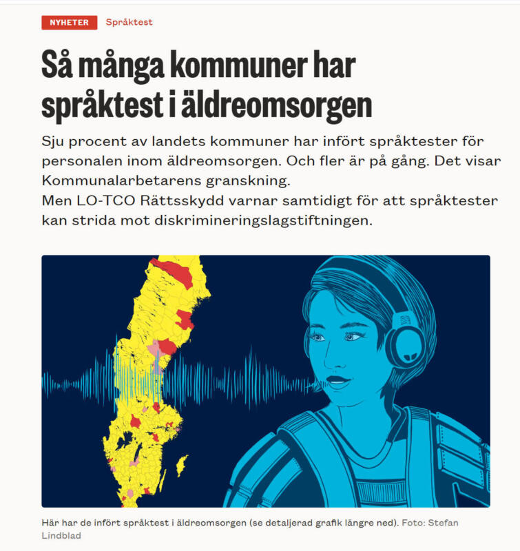Språktest för anställda inom kommunal, äldrevården, äldreboende, underskötersska. Kvinna med hörlurar. Exempel visar innan tryck, tryckt uppslag två sidor i tidskriften Kommunalarbetaren, samt deras webbtdning