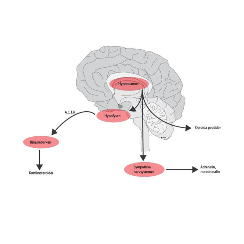 Den hypotalamiska-hypofysära-adenokortikala-axeln, HPA, och de substanser, stresshormoner och opioider, som frisätts vid stress och smärta. Ur läroboken Orofacial smärta, ett multidiciplinärt omhändertagande