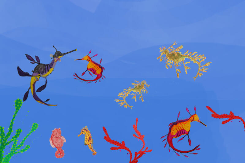 Sjöhästar och sjödrakar träffas vid korallen. Alla figurer är målade i färgpennor, akvarell och akryl, de simmar i en digitalt skapad ocean