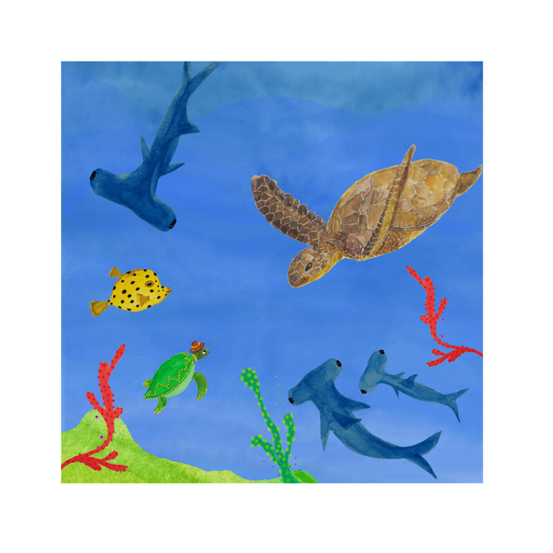 Sköldpaddan Lisa hälsar havsköldpaddan välkommen till revet, Hammarhajarna vill vara med. Figurerna är målade i akvarell oceanen är digital