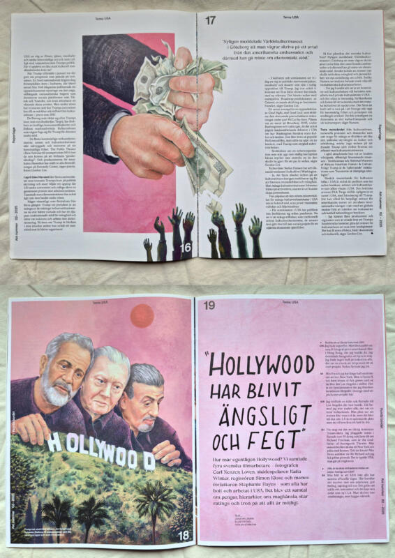 Omslagsillustration, 4 illustrationer och handtextade rubriker till tidningen AKT. Artikel handlar om Donald Trumps politiska inverkan på den amerikanska kulturscenen.