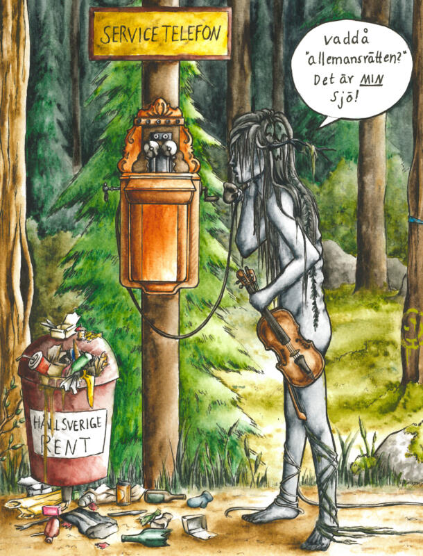 Färgglad och detajerad illustration föreställande en skog med en liten sjö i bakgrunden och i förgrunden står Näcken. Han håller sin fiol i ena handen och försöker ringa ett samtal på en service telefon. Telefonen är av tidig modell, 1800-tal. Bredvid Telefonstolpen står en överfull soptunna med texten "Håll Sverige rent". Överallt i skog och mark ligger skräp och avfall.  Runt sjön har Näcken satt upp skyltar med texter som "Privat område!!", "Rör ej vattnet!", "Stör ej!" och "Privat vatten". I en pratbubbla säger Näcken upprört till personen i luren: "Vaddå, 'allemansrätten'? Det är MIN sjö!".