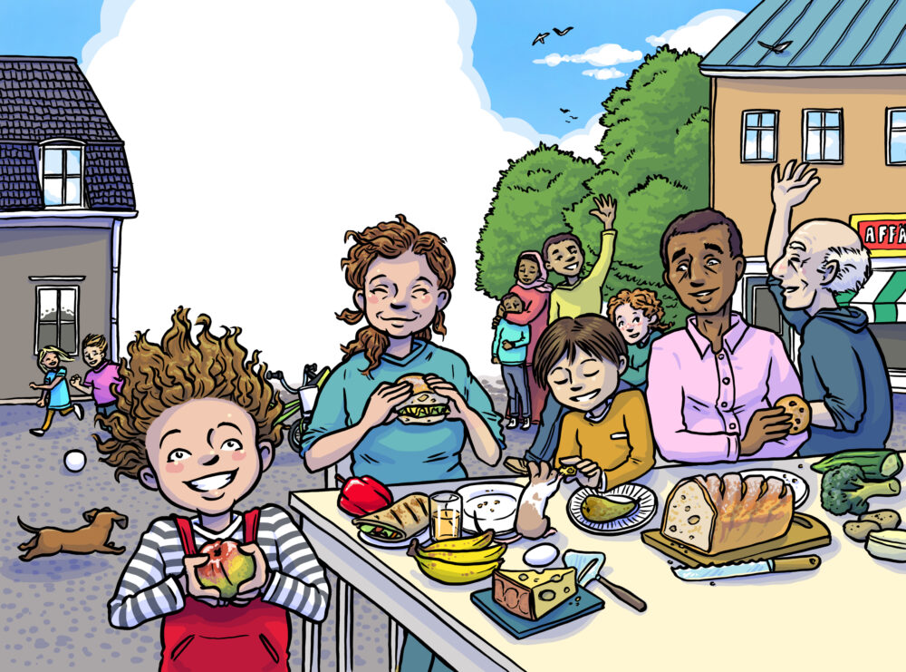 Uppslag ur Zakis resa: Frukost utomhus på torget. En bilderbok om FN:s globala hållbarhetsmål