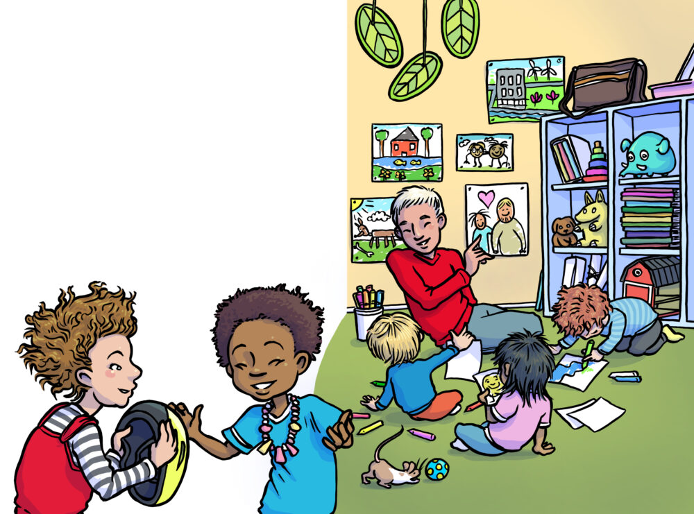 Uppslag ur Zakis resa: Zaki kommer fram till förskolan. En bilderbok om FN:s globala hållbarhetsmål