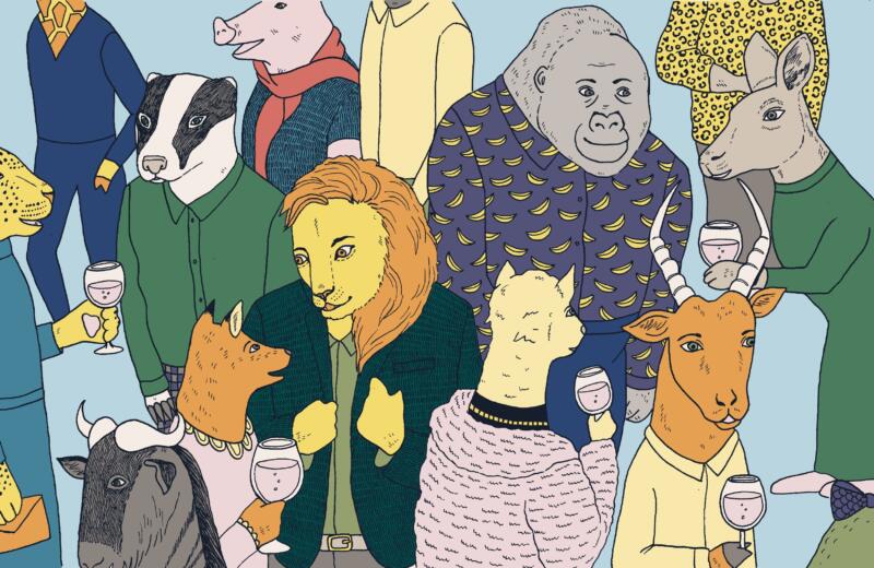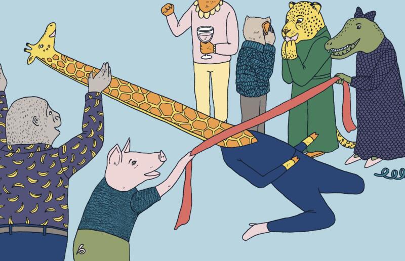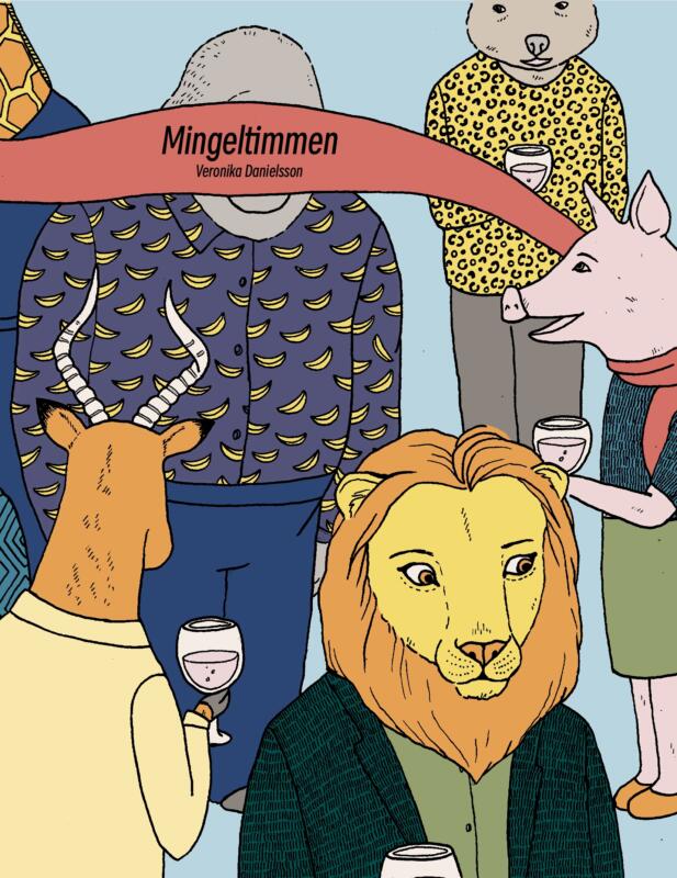 Under kursen ”Att bilderboksberätta 1” på HDK fick vi i uppgift att göra en bilderbok med tolv uppslag. Jag valde att göra en tyst bilderbok om ett gäng djur som är på mingel och de relationer och konflikter som utvecklas under kvällens gång.
